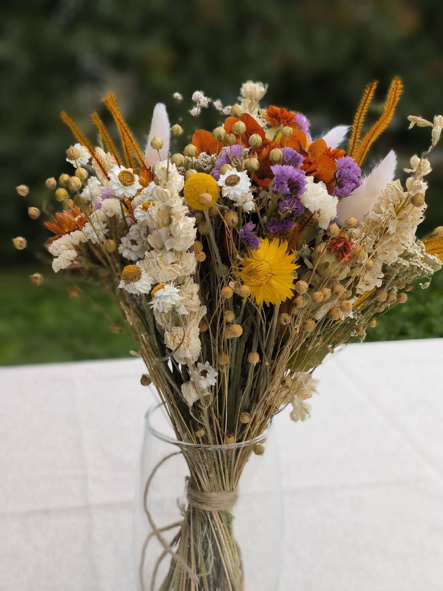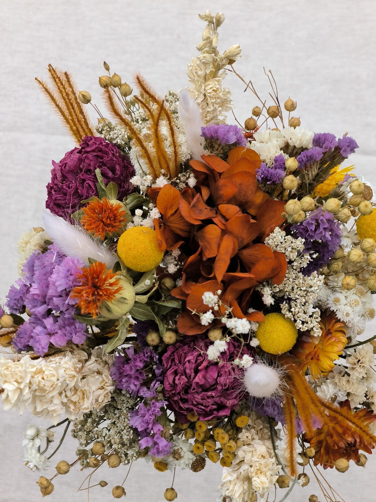 Ces fleurs sont cultivées et séchées en Auvergne hormis une touche d'hortensia stabilisé pour des tons d'automne.