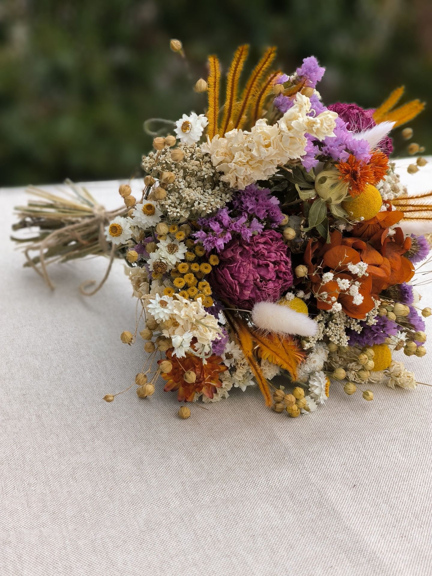Bouquet riche en fleurs et couleurs aux tons chauds : pivoine, delphinium, craspedia, statices, immortelles, amobium , lin.... (largeur 22 cm environ) idéal pour un mariage d'automne ou d'hiver ou pour réchauffer son intérieur.